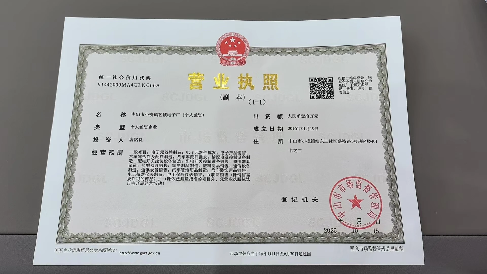 Company Name : Zhongshan Xiaolan Yicheng Electronics Factory (Sole Proprietorship)